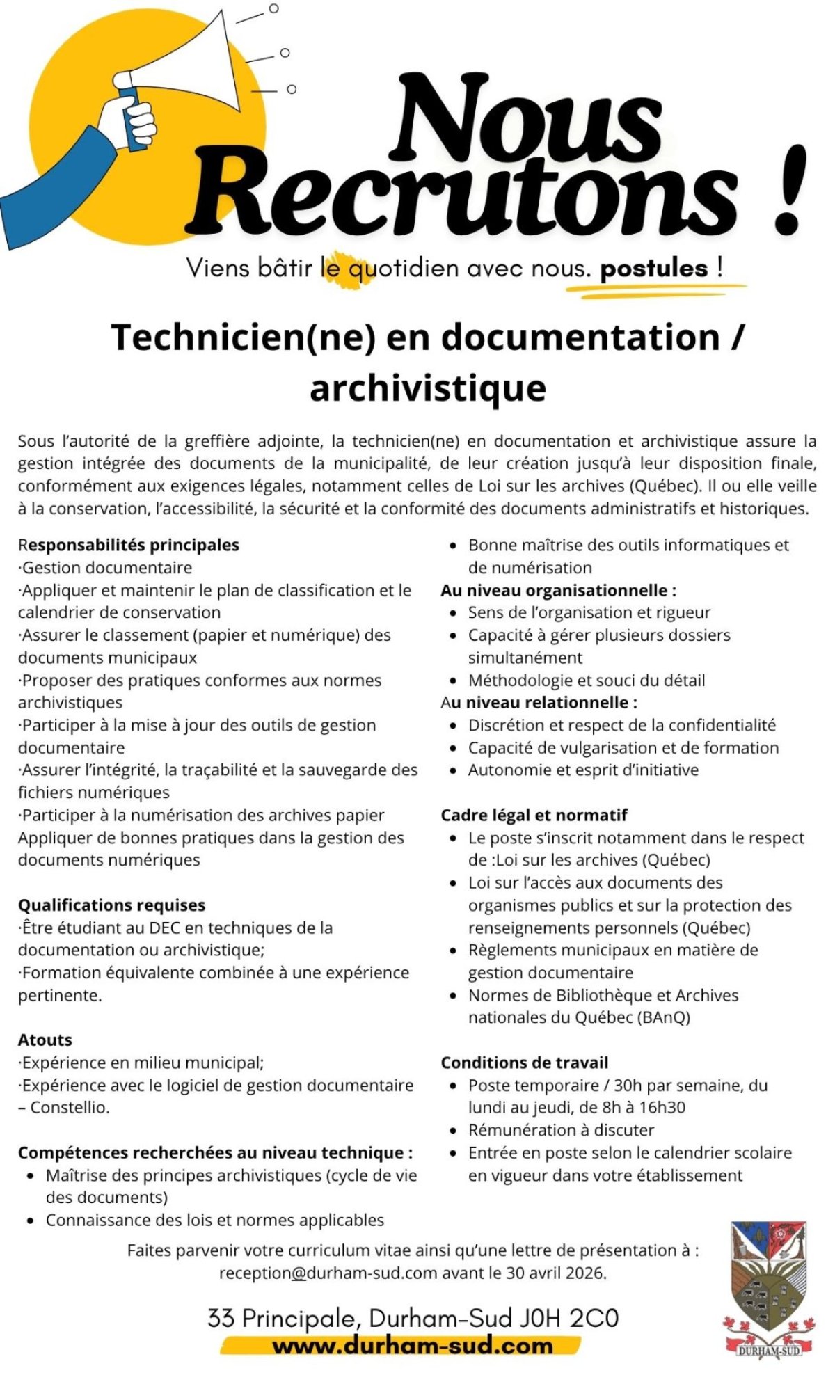 Faites parvenir votre curriculum vitae ainsi qu’une lettre de présentation à : reception@durham-sud.com avant le 30 avril 2026.